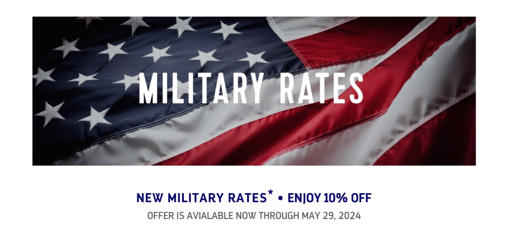 Eligibility: To qualify for these rates, military members or their spouses must present valid proof of service, such as a military ID.